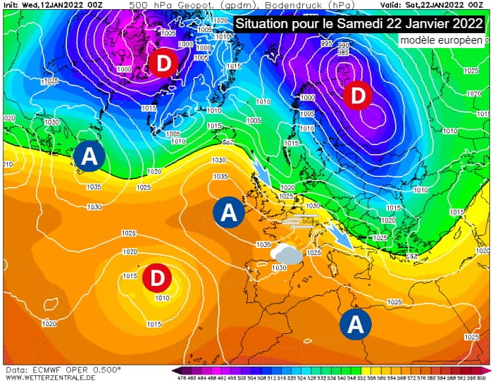 Situation modélisée par le modèle européen pour le samedi 22 janvier 2022 - via wetterzentrale.de