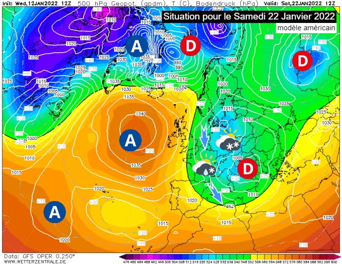 Situation modélisée par le modèle américain pour le samedi 22 janvier 2022 - via wetterzentrale.de