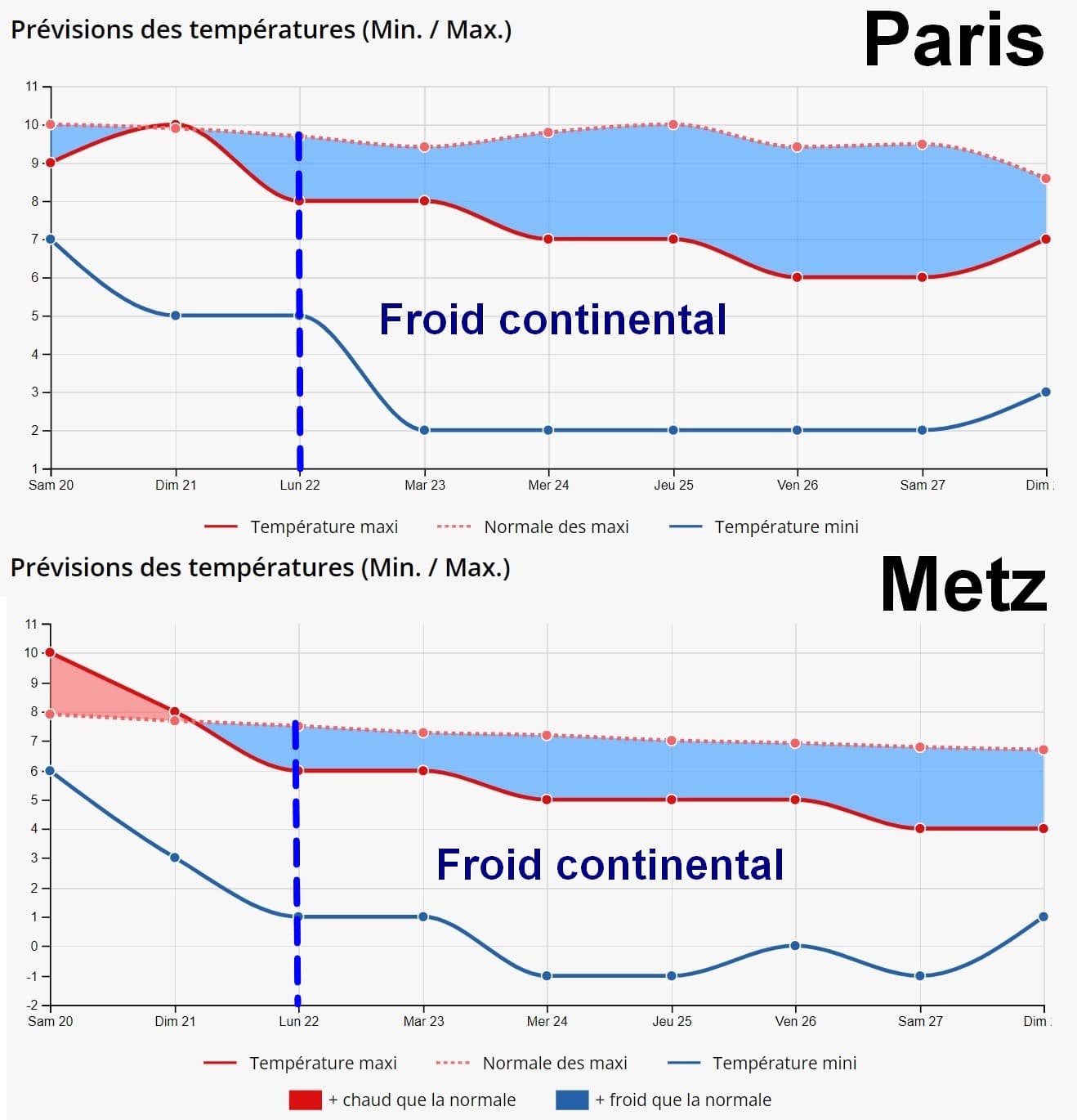 Ainsi, le ressenti s'annonce donc plus froid que ces derniers jours sur une large partie Nord de la France avec des températures repassant le plus souvent sous les normes de saison. L'absence de neige au sol sur l'Europe de l'Est devrait néanmoins limiter l'intensité de cette coulée froide avec un albédo de ce fait moins important et un froid s'écoulant plus rapidement sur ces régions.
