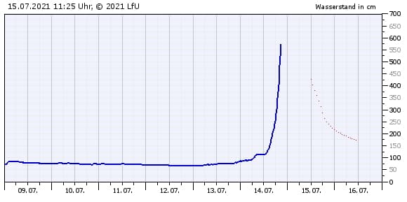 Les scènes de dévastation y sont catastrophiques. Dans le village de Schuld situé en Rhénanie-Palatinat (ouest du pays), la rivière Ahr s'est transformée en un véritable torrent. La puissance inouïe des flots a surpris tout le monde et emporté des maisons en soirée et nuit du 14 au 15 juillet 2021, faisant perdre la vie à de nombreux habitants. Dans ce secteur, la station de mesure a enregistré une élévation très rapide de 5 mètres du niveau de la rivière Ahr, avant de cesser de fonctionner. Lors de la dernière mesure, le niveau était déjà 2 mètres au dessus du record historique ! Le comparatif entre la situation habituelle et celle observée ce matin du 15 juillet 2021 fait froid dans le dos, montrant une élévation du niveau du cours d'eau de l'ordre de 7 à 8 mètres !