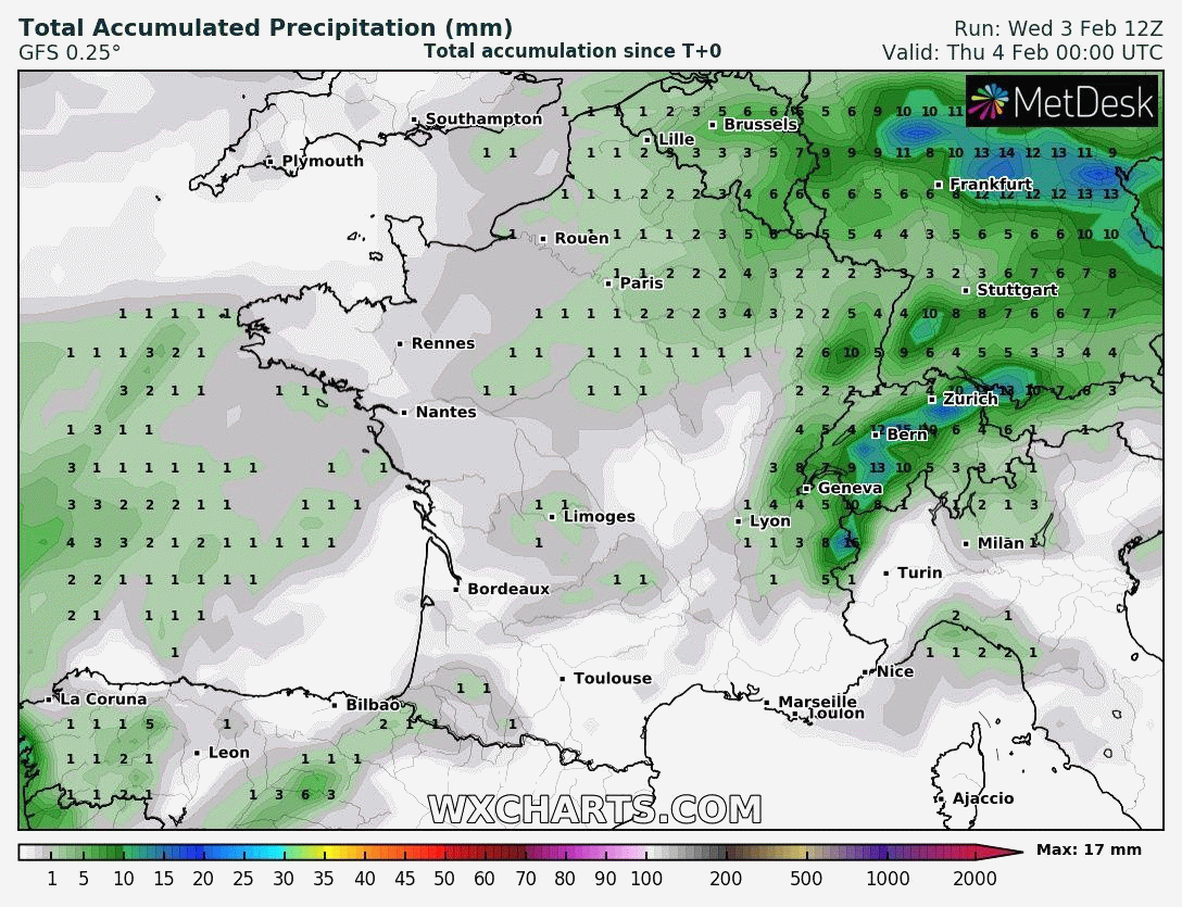 L'animation ci-dessus montre une temporaire accalmie du point de vue des précipitations pour la journée du jeudi 4 février 2021. Les pluies deviendront un peu plus fréquentes de l'Aquitaine au nord-est vendredi puis plus actives durant le week-end, notamment sur un axe allant du sud-ouest au nord-est - touchant les régions où les crues sont déjà présentes. Si les quantités seront moins importantes que ces derniers temps, les cours d'eau seront tout de même susceptibles de réagir dans la mesure où les sols sont totalement saturés.