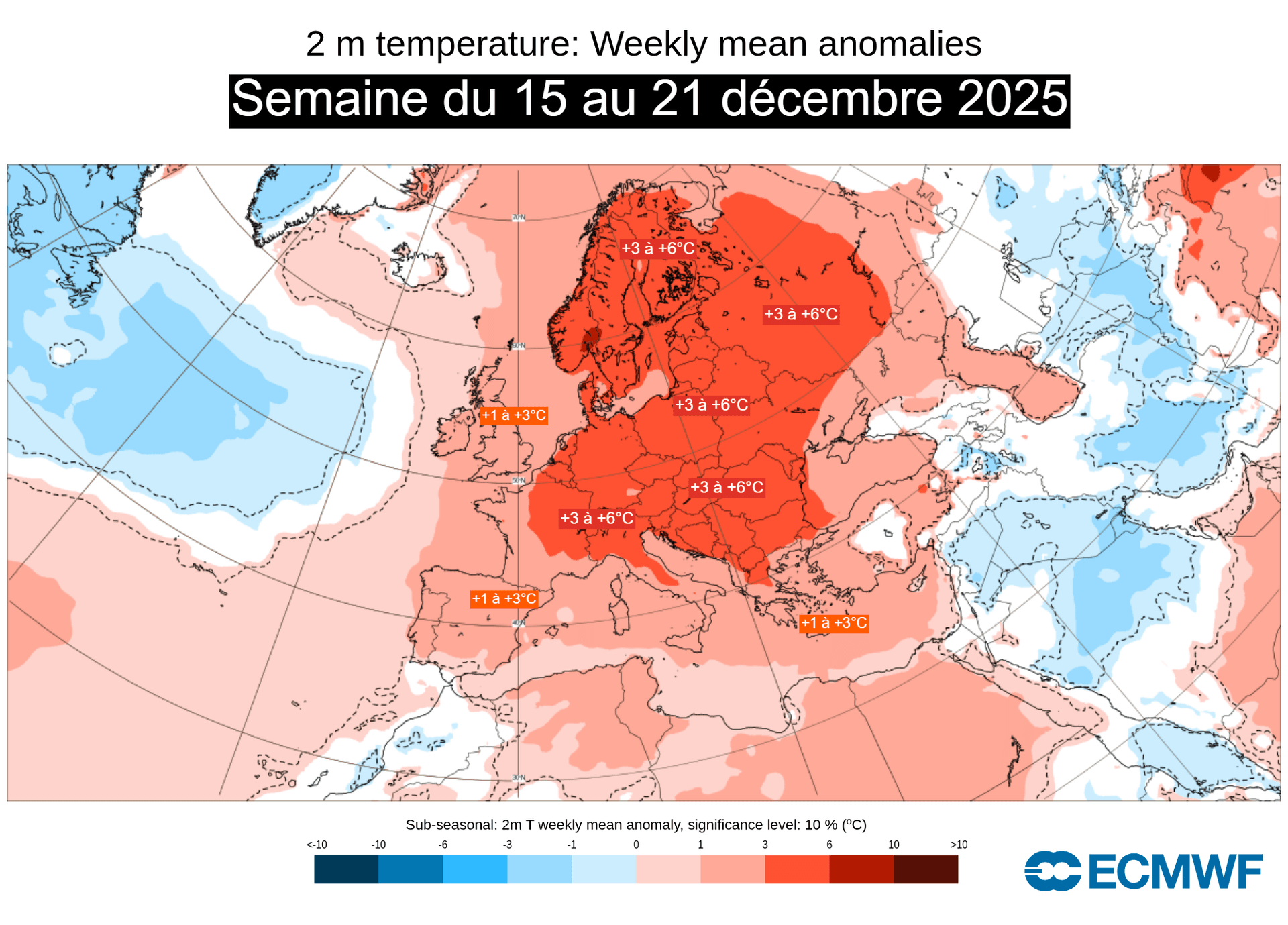 Anomalies de températures sur l'Europe pour la semaine du 15 au 21 décembre 2025 – ECMWF