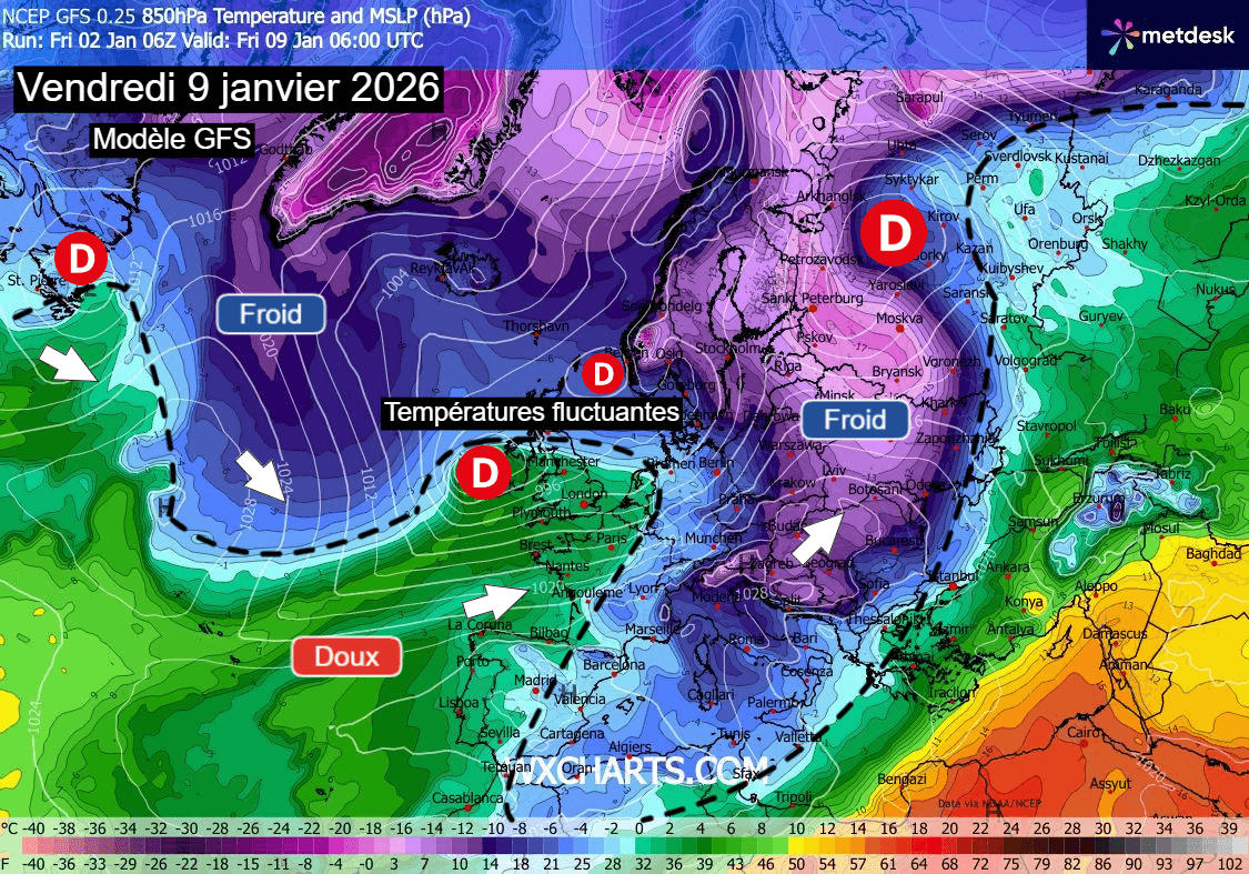 Situation envisagée pour le 9 janvier 2025 – Modèle GFS via WX CHARTS
