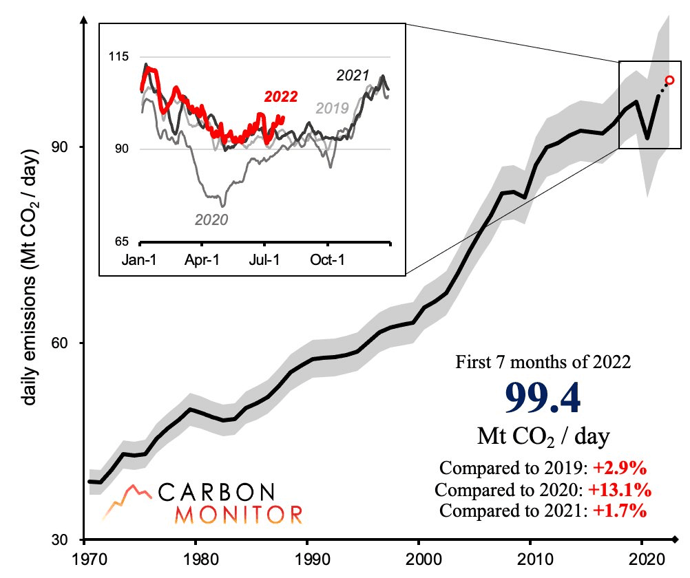 Après un bref recul au plus fort de la pandémie du covid, les émissions mondiales de CO₂ sont de nouveau en hausse et le record annuel est bien parti pour être battu en cette année 2022, qui deviendra la pire en terme de rejet de dioxyde de carbone. Malgré les multiples accords sur le climat et l'urgence climatique, inverser la tendance de manière drastique semble quasiment impossible. Si les pays comme la France ont réduit considérablement leurs émissions par rapport au siècle dernier, les pays émergents voient leurs émissions exploser tandis que les super-puissances que sont la Chine et les États-Unis continuent de rejeter des quantités astronomiques de CO₂.