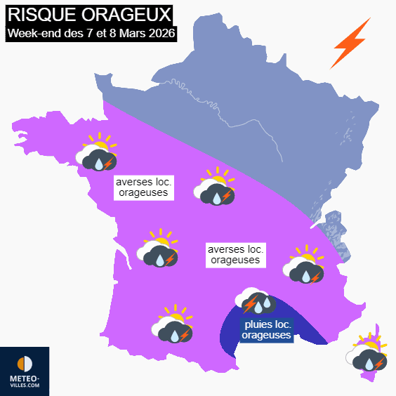Risque orageux pour le week-end des samedi 7 et dimanche 8 mars 2026 - Météo Villes