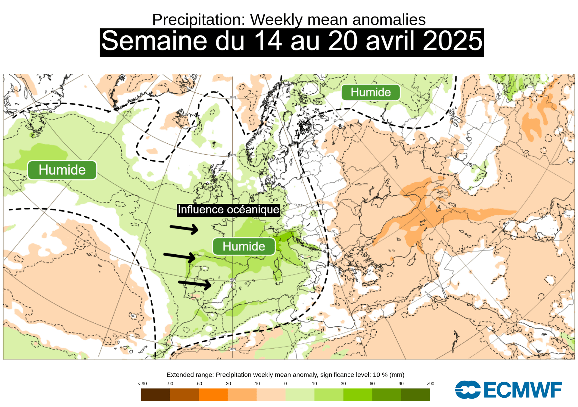 Ce type de temps devrait d'ailleurs persister la semaine prochaine avec le retour de conditions humides/instables plus durables sur notre pays, en témoignent les anomalies de précipitations attendues sur l'Europe pour la semaine du 14 au 20 avril 2025.
