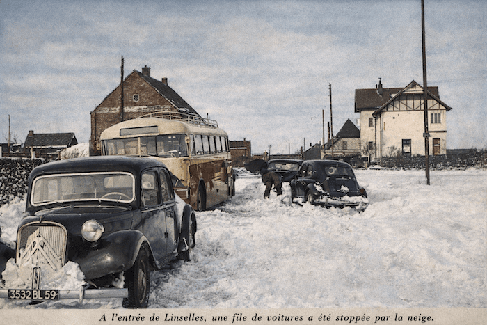 Dans la nuit du 25 au 26 février 1958, une violente tempête de neige frappe toute la moitié nord de la France, et particulièrement le Nord-Pas-de-Calais. En quelques heures, 10 à 15 cm de neige tombent, balayés par des rafales proches de 120 km/h. D’immenses congères se forment, bloquant routes et autoroutes. Des centaines d’automobilistes se retrouvent piégés dans leur véhicule, incapables d’avancer ou de faire demi-tour. En pleine nuit, des milliers de voitures sont abandonnées en rase campagne. Le bilan est dramatique : quatre personnes perdent la vie.