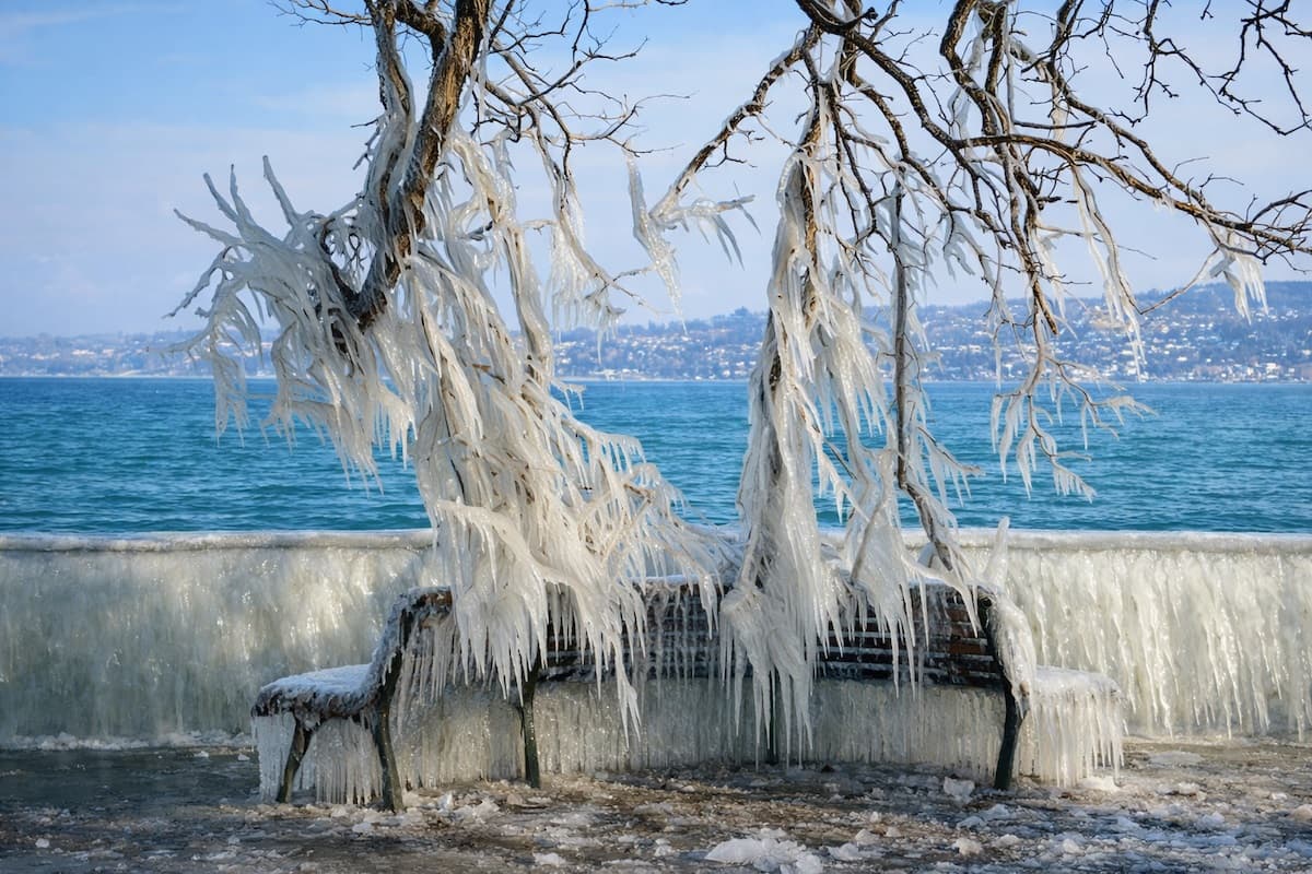 Sous le froid vif et persistant, les embruns piègent les rives du lac Léman sous la glace au début du mois de mars 2005