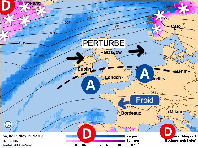 Situation météorologique de ce dimanche 2 mars 2025, l'anticyclone coupe notre pays de l'apport d'air doux océanique, ce qui se traduit par l'apport d'air continental froid - MeteoVilles