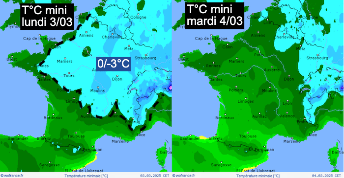 Températures minimales prévues le 3 et le 4 mars 2025, le gel apparaît en bleu - WeatherOnline