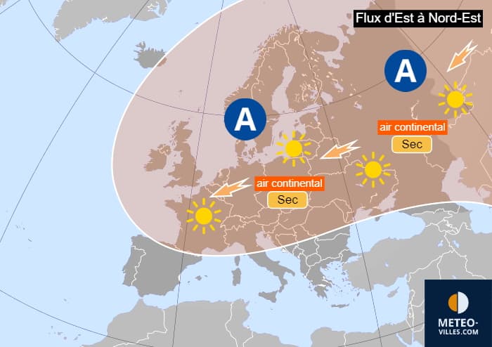 Schéma d'une situation anticyclonique entraînant un flux d'est à nord-est en France - Météo Villes