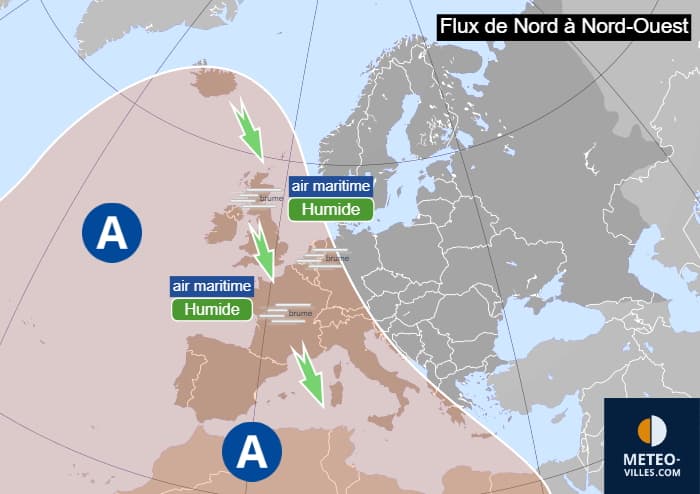 Schéma d'une situation anticyclonique entraînant un flux de nord-ouest à nord en France - Météo Villes