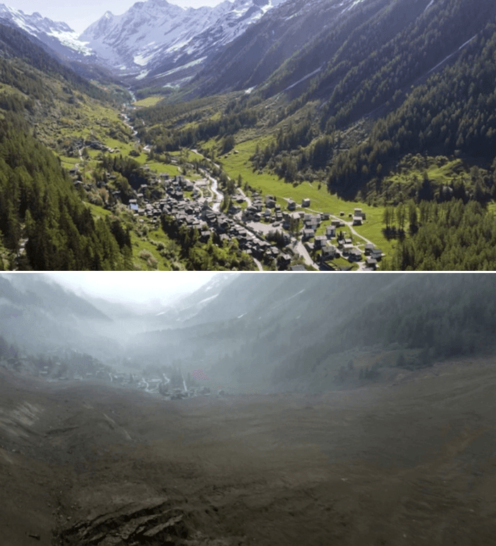 Fort heureusement, le village avait été évacué le 19 mai dernier car la menace avait été clairement identifiée, après de premiers éboulis. Le glacier avançait alors de plusieurs mètres par jour, montrant son instabilité et laissant craindre le pire. Malgré ces évacuations, un homme de 64 ans est porté disparu ce jeudi. La comparaison avant/après est stupéfiante et montre l'ampleur colossale de cet éboulement qui a dévasté le village de Blatten.