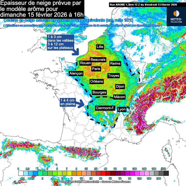 La fourchette basse du modèle météo arpège indique des épaisseurs comprises entre 1 et 3 cm alors que la fourchette haute des modèles METEO européen et arôme indique 1 à 3 cm dans les vallées (peut-être seulement une neige ne tenant pas au sol dans Paris) et jusqu'à 10 cm sur les plateaux. Cette possible grande différence sera liée à la température au moment où auront lieu les précipitations, car il fera entre 0 et +1°C. Il suffira donc de sortir de l'îlot de chaleur des agglomérations et de monter sur les plateaux à plus de 100 à 150 m d'altitude pour passer d'un paysage sans neige à un paysage très enneigé.