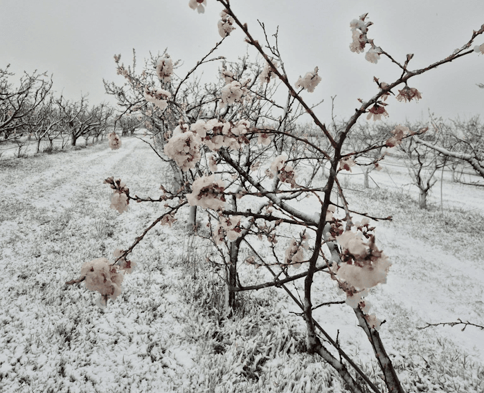 Abricotiers en fleurs sous la neige à Martigny (Suisse) à 400 mètres d'altitude ce jeudi 26 mars 2026 - photo Georges Delaloye