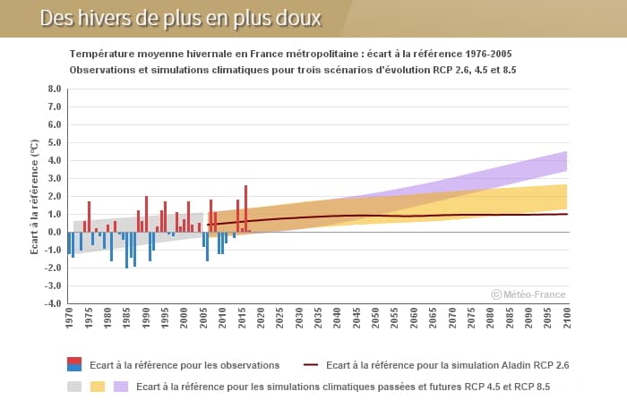 Comme le montre la simulation ci-dessous, les différents scénarios de l'évolution du climat d'ici la fin du siècle sont unanimes. Tous envisagent la poursuite de la hausse des températures moyennes lors de la saison hivernale. Les récents hivers doux devraient ainsi devenir monnaie courante au cours des prochaines décennies. Certains scénarios se distinguent après 2050, envisageant un emballement de la hausse des températures avec à la clé des anomalies douces encore jamais observées de nos jours.
