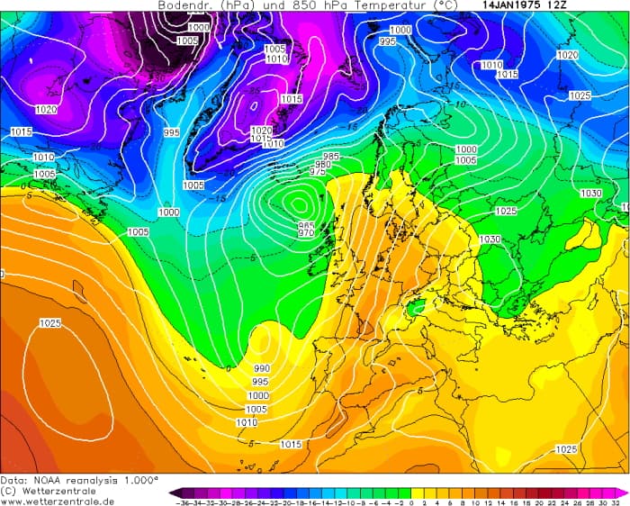 Réanalyse de la situation à échelle continentale le 14 janvier 1975 - via wetterzentrale.de