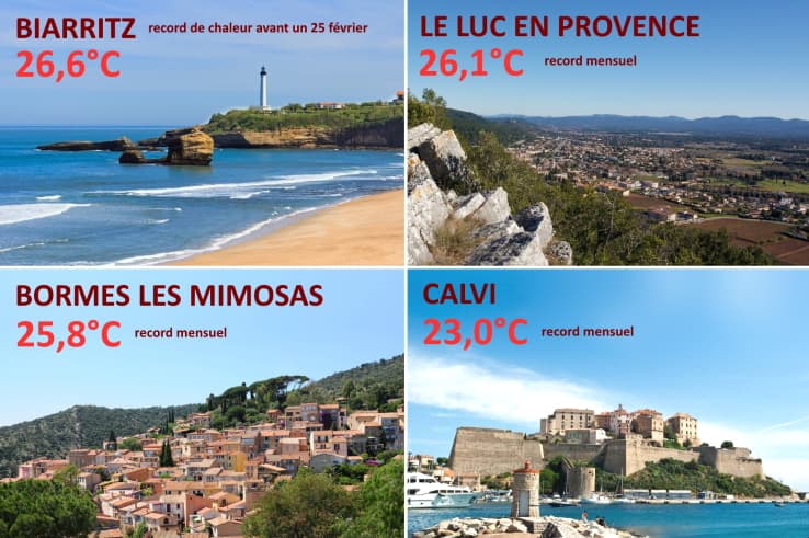 Si les journées les plus chaudes en France en février ont été principalement observés au siècle dernier, la majorité des stations métropolitaines ont toutefois observé leur record mensuel en février après 2010 (62% des stations mesurant depuis au moins 1970, soit 217 stations sur 351. Pour les stations les plus anciennes, certains records de février 1958, 1960 et 1961 résistent toujours tant bien que mal. En janvier, ce sont 39% des stations (mesurant depuis au moins 1970) qui ont observé leur record de douceur mensuel à partir de 2010 soit au cours des 15 dernières années.