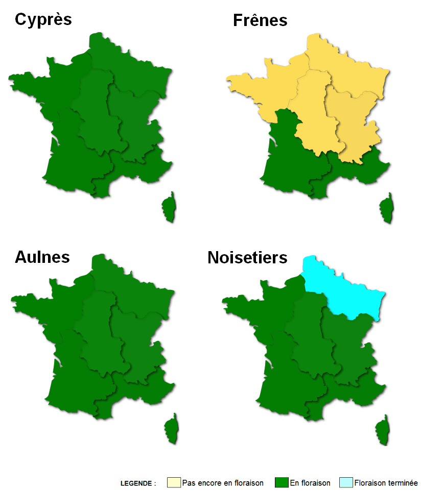 De ce fait, tout le pays sans exception sera concerné par les pollens pour le début du mois de mars, avec des concentrations plus élevées d’aulnes sur le Nord du pays et de cyprès (très allergisants) sur le Sud.