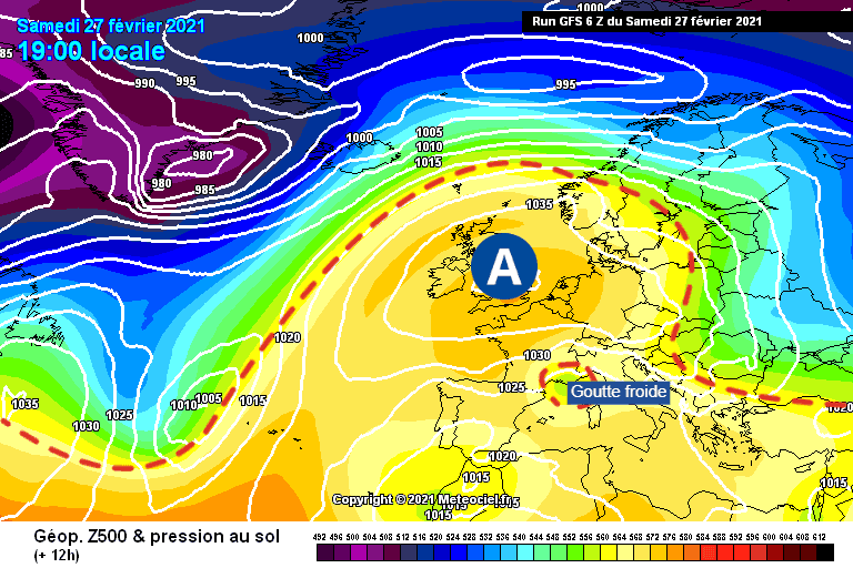 Schéma de la situation atmosphérique sur l’Ouest de l’Europe ce samedi 27 février 2021 – Modèle GFS via meteociel.fr