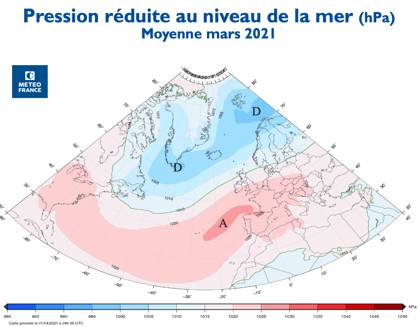 Pression moyenne au cours du mois de mars 2021 - Météo France