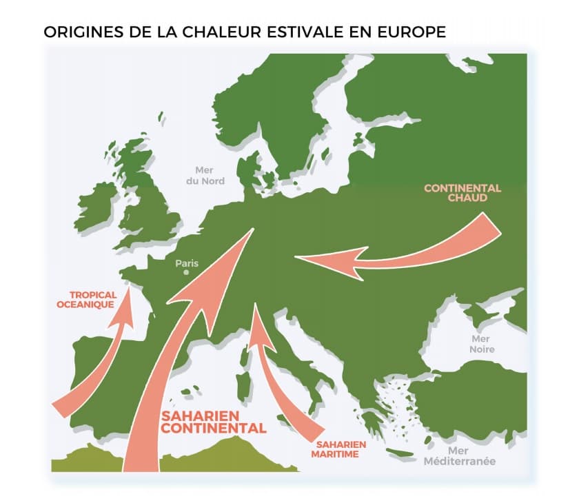 Origine de la chaleur estivale en France – Schéma tiré du livre METEO EXTREME p10