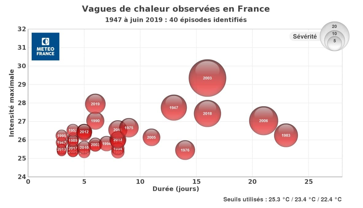 Classement des vagues de chaleur observées en France entre 1947 et Juin 2019 – Tiré du livre METEO EXTREME p11
