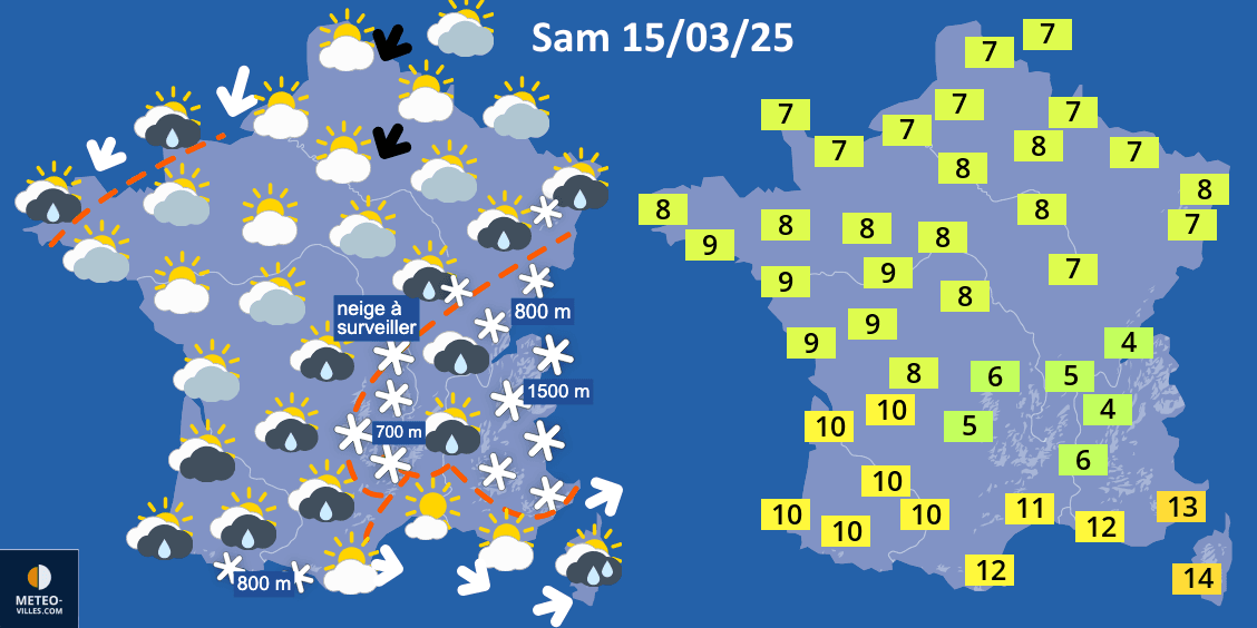 Le week-end va débuter par un samedi 15 mars 2025 très mitigé. On attend des précipitations fréquentes dans le centre-est de la France, des Alpes vers le Massif Central. Par effet d'isothermie (présence d'air froid en altitude), il faudra surveiller le risque de neige à très basse altitude, notamment aux abords du Massif Central. Ailleurs, quelques ondées seront possibles, surtout au sud-ouest, en Manche et en Corse. Les températures vont plafonner entre 4 et 6°C au centre-est, souvent 7 à 10°C ailleurs et 11 à 14°C en Méditerranée.
