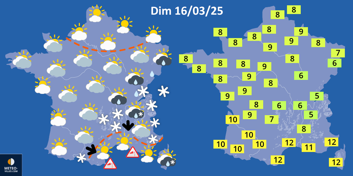 La journée du dimanche 16 mars 2025 devrait rester nuageuse. Il y aura probablement des résidus humides dans le centre-est de la France avec des flocons tombant encore à basse altitude. De plus larges éclaircies sont prévues vers le golfe du Lion et sur les régions septentrionales. La fraîcheur va rester au programme avec seulement 5 à 6°C au centre-est, généralement entre 8 et 10°C ailleurs et plutôt une douzaine de degrés en Méditerranée.