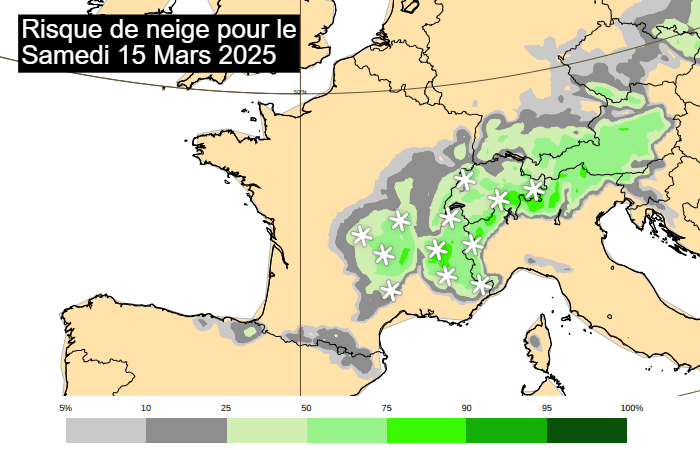 Probabilité de précipitations neigeuses pour le samedi 15 mars 2025 - ECMWF