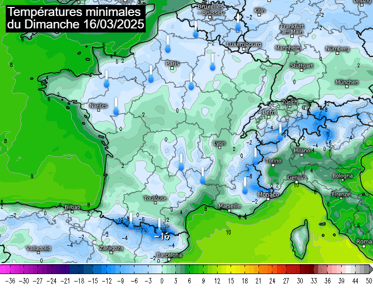 Températures minimales prévues le dimanche 16 mars 2025 - meteologix.com
