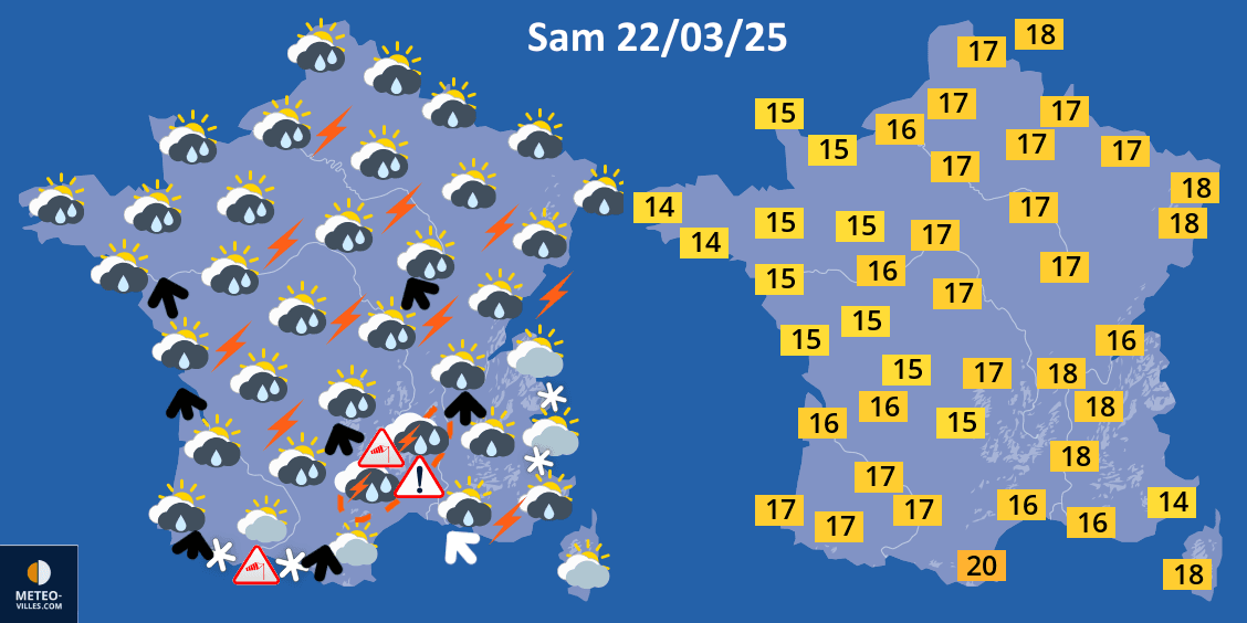 Le week-end débutera par un samedi 23 mars 2025 instable. En présence d'air doux au sol mais froid en altitude, de nombreuses averses vont se déclencher en cours de journée. Elles pourront être fortes et prendre un caractère orageux, notamment du sud-ouest aux régions du nord. Par ailleurs, de fortes pluies à caractère orageux se bloqueront sur le relief des Cévennes. Le vent de sud sera soutenu aux abords du Massif Central et jusqu'au val de Saône. Malgré tout, il fera encore très doux avec souvent 15 à 18°C.