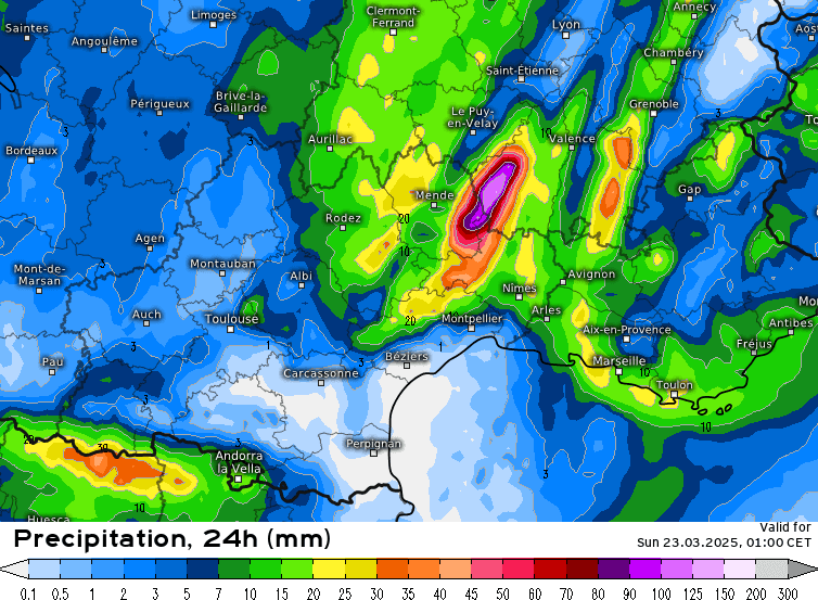 Cumuls de pluie dans le sud de la France le samedi 22 mars 2025 - meteologix.com