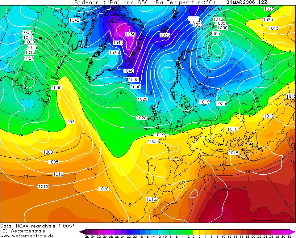 Mardi 21 mars 2006 : L’air froid déjà présent depuis quelques jours sur l’Europe du nord, s’infiltre sur un tiers nord de la France. Le contraste de températures est important entre Paris où il ne fait pas plus de 3° l’après-midi et Bourges, où l’on dépasse les 16°. Quelques chutes de neige ont lieu sur le Nord-Pas de Calais et le département de l’Aisne.