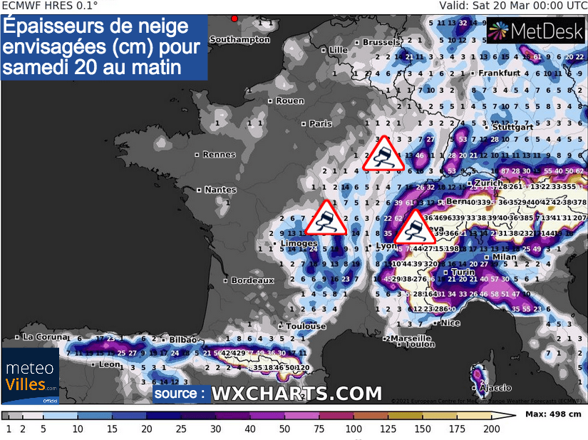 Neige prévue au sol selon le modèle météo européen ECMWF HRES (carte WXCHARTS) pour samedi 20 mars 2021 au matin