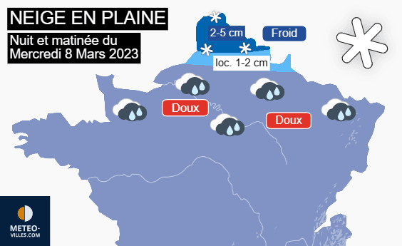Les précipitations neigeuses devraient surtout se produire en seconde partie de nuit du mardi 7 au mercredi 8 mars 2023 et jusqu'en matinée de mercredi. Elles intéresseront principalement le Nord-Pas-de-Calais où la couche pourrait atteindre 2 à 5 centimètres selon les secteurs (flocons tombant par une température proche de zéro). En limite, un petit saupoudrage pourrait être observé sur le flanc nord de la Picardie ainsi que sur le nord du département des Ardennes.