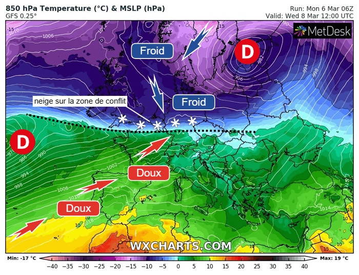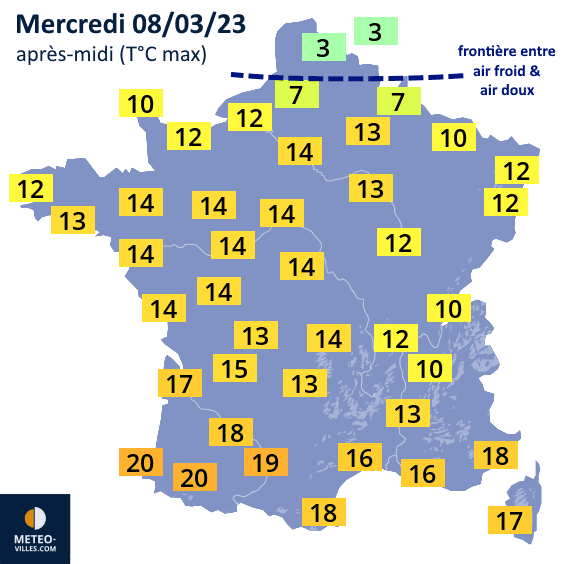 Pour mesurer l'ampleur de ce conflit de masses d'air, il suffit de regarder les températures attendues pour l'après-midi du mercredi 8 mars 2023. L'air doux océanique envahira la quasi-totalité du territoire sous le flux de sud-ouest (jusqu'à 20°C au pied des Pyrénées) ! Pendant ce temps, une poche d'air froid résistera en flux continental sur l'extrême nord et la Belgique (de 0°C le matin à 3°C l'après-midi pour Lille & Bruxelles). Sur le nord de la France, les contrastes seront saisissants sur de courtes distances avec 3°C à Lille mais 14°C à Paris !