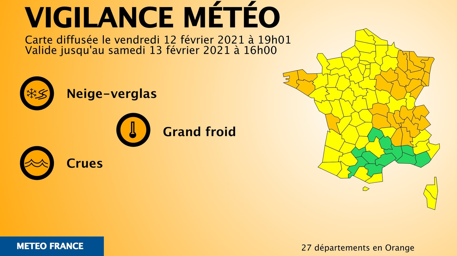 Carte de vigilance Météo-France du vendredi 12 février à 19h00 : 27 départements en vigilance orange