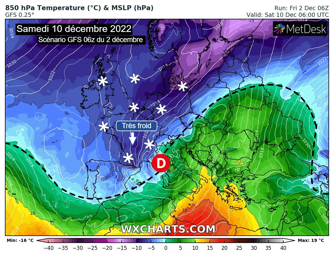 Situation atmosphérique envisagée pour le mercredi 7 décembre 2022 – Modèle GFS via WX CHARTS