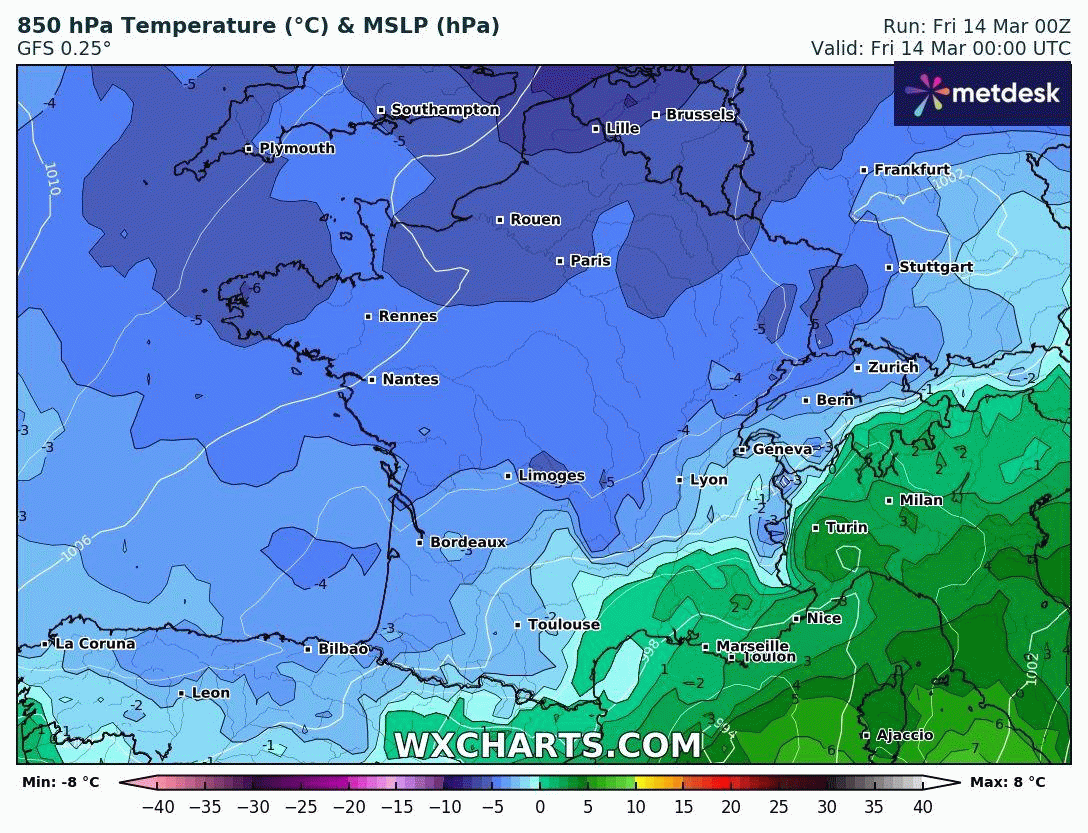 Animation des températures à 850hPa sur la France du 14 au 16 mars 2025 – Modèle GFS via WX CHARTS