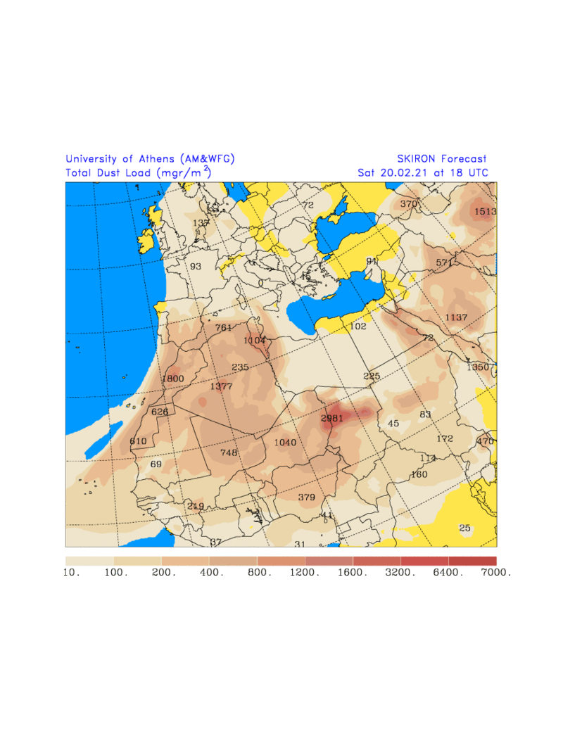 Transport de sable Saharien - prévision jusqu'au mercredi 24 février 2021 - Université d'Athènes