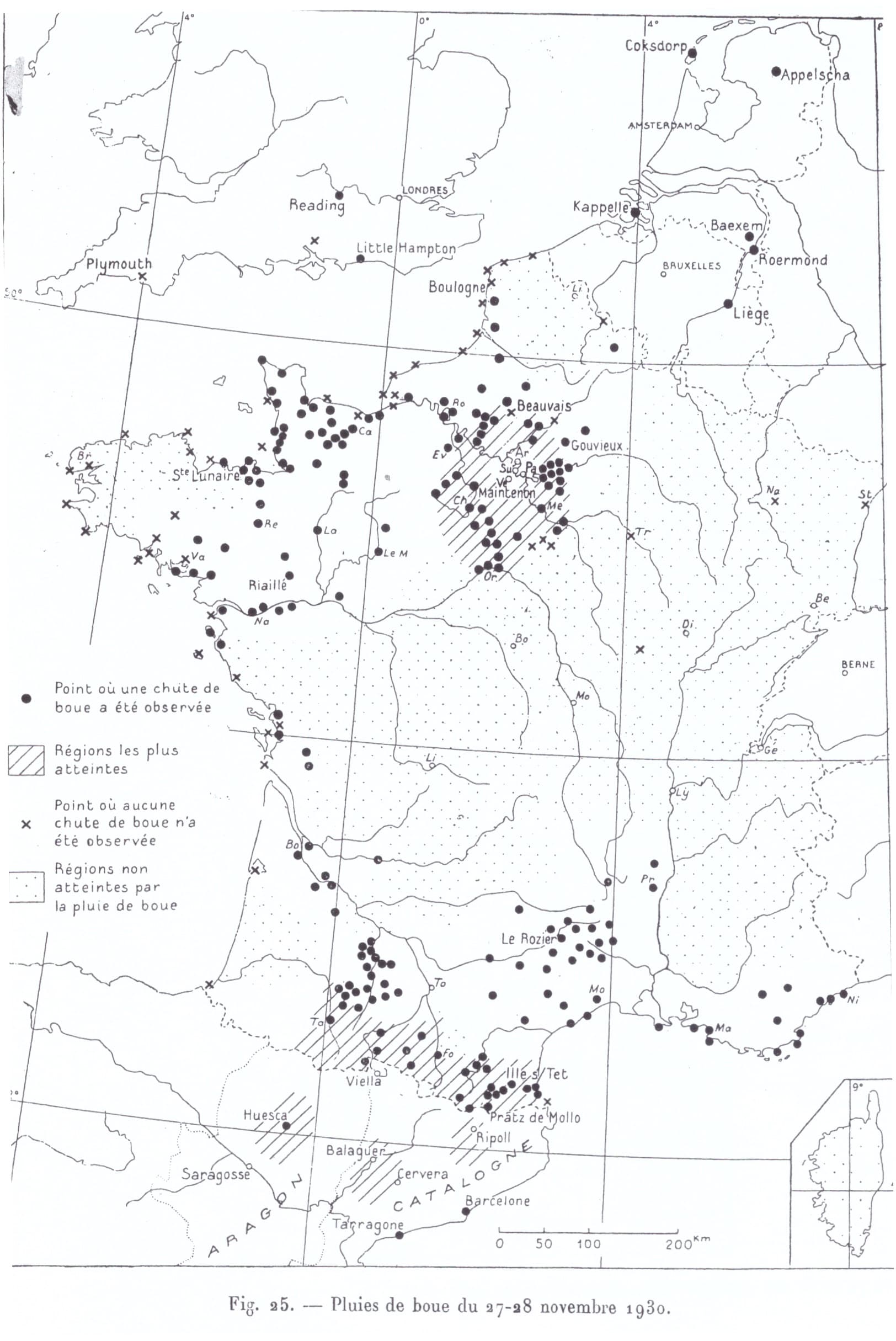 Carte d'observation de pluies de boue en France - 27 et 28 novembre 1930