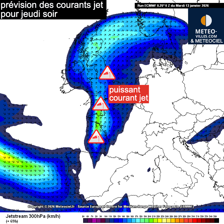 Prévision des courants jets pour jeudi soir sur l'Europe occidentale