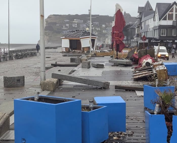 Les dégâts sur le front de mer de Fécamp après la grosse houle subversive de la tempête Goretti. La station du sémaphore a mesuré 157 km/h !  (© Le Phare à Images)