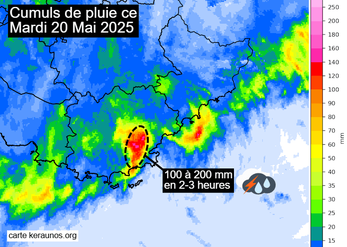 Avec une activité très importante et un caractère stationnaire durant deux heures, ces orages ont conduit à des cumuls de précipitations remarquables durant la matinée du mardi 20 mai 2025. C'est sur une zone géographique restreinte que se sont abattues les pluies diluviennes. On a enregistré des cumuls de 100 à 200 mm en seulement 2 à 3 heures au nord-est immédiat du Lavandou. La station de Vidauban a totalisé 187 mm dont 107 mm tombés entre 10h et 11h !