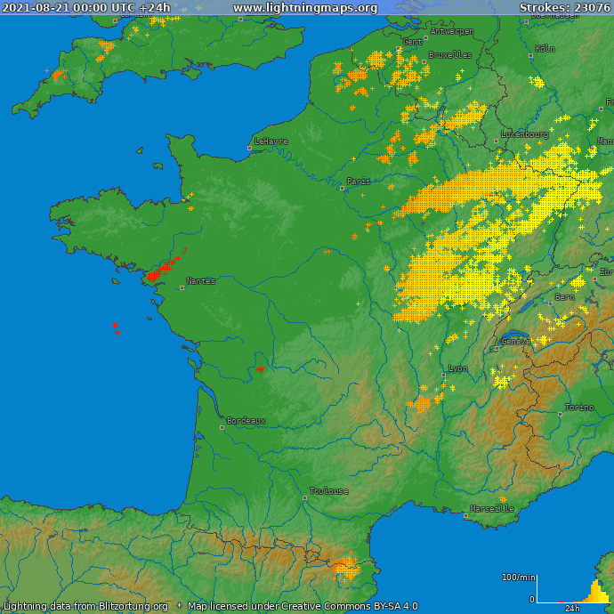 Carte des impacts de foudre en France - samedi 21 août 2021 - LightningMaps
