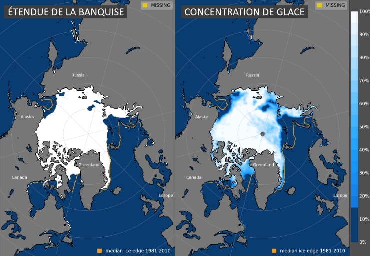Au 11 novembre 2020, l'étendue de la banquise en Arctique est toujours exceptionnellement basse. Il s'agit même de la deuxième étendue la plus faible jamais observée à cette date. Seul 2016 faisait pire à la même période. Entre la mi-octobre et le tout début novembre 2020, l'étendue de la banquise était même la plus faible jamais observée depuis le début des mesures, plus de 3 millions de kilomètres carrés en dessous de la normale 1981-2010 !