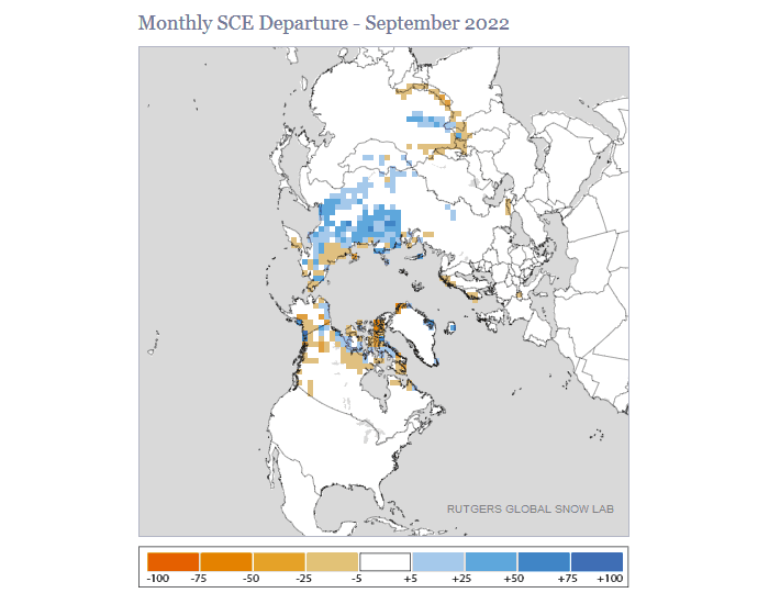 Anomalies d'enneigement dans l'hémisphère nord sur le mois de septembre 2022 - via Rutgers Global Snow Lab