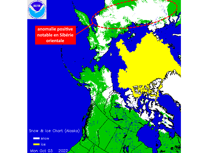 Sur la carte ci-dessous, on constate que l'enneigement est encore restreint dans le nord de l'Amérique, pour l'instant cantonné aux régions les plus proches du pôle. À l'inverse, on observe que l'enneigement est bien plus étendu du côté de l'Eurasie. La Sibérie orientale est particulièrement concernée. De vastes zones ont d'ores et déjà les pieds dans la neige en ce début du mois d'octobre 2022. Le froid n'a donc pas tardé à s'installer sur cette partie de l'hémisphère nord.
