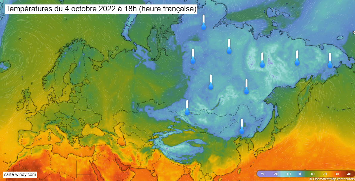 Températures en Eurasie le mardi 4 octobre 2022 à 18h (heure française) - via windy.com